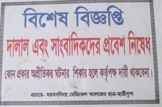 ময়মনসিংহ মেডিক্যাল কলেজ হাসপাতালের বিভিন্ন দেয়ালে ‘সাংবাদিক প্রবেশ নিষেধ’ বিশেষ বিজ্ঞপ্তি সাঁটানো হয়েছে। পোস্টার সাইজের সাদা কাগজে রঙিন হরফে কম্পিউটার কম্পোজ করে ওই বিজ্ঞপ্তিতে বলা হয় ‘বিশেষ বিজ্ঞপ্তি দালাল এবং সাংবাদিকদের প্রবেশ নিষেধ। কোন প্রকার অপ্রীতিকর ঘটনার শিকার হলে কর্তৃপক্ষ দায়ী থাকবে না। প্রচারে : ময়মনসিংহ মেডিক্যাল কলেজের ছাত্র-ছাত্রীবৃন্দ।’ এমন উস্কানিমূলক বিজ্ঞপ্তি কে বা কারা কখন দেয়ালে দেয়ালে সাঁটিয়েছে তা কেউ বলতে না পরলেও বৃহস্পতিবার সকালে বিষয়টি কর্তৃপক্ষের নজরে পড়ে। সকালে সাংবাদিকদের পক্ষ থেকেও হাসপাতালের ভারপ্রাপ্ত পরিচালক ও মেডিক্যাল কলেজের অধ্যক্ষকে অবহিত করা হয়। কিন্তু সন্ধ্যা সাতটা পর্যন্ত কোনো বিজ্ঞপ্তি অপসারণ করা হয়নি।