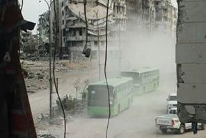 জাতিসংঘের তত্ত্বাবধানে সিরিয়ার সরকারের পক্ষ থেকে দেয়া সবুজ বাসের বহরে চড়ে বিদ্রোহীরা হোমস ত্যাগ করে।