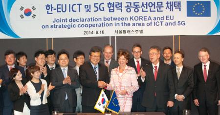 ইইউ’র এক আনুষ্ঠানিক বিবৃতিতে বলা হয়, দু’পক্ষ গত সোমবার সিউলে তথ্য যোগাযোগ প্রযুক্তি (আইসিটি) ও ৫-জি খাতে সহযোগিতা সম্পর্কিত এক যৌথ ঘোষণায় স্বাক্ষর করে। তারা আইসিটি সম্পর্কিত বিদ্যমান সহযোগিতার মূল ক্ষেত্র নেট ফিউচারস (নেটওয়ার্ক এন্ড কমিউনিকেশনশ, ৫-জি, ক্লাউড কম্পিউটিং) পরিসীমায় আলোচনা গভীরতর করার উপর জোর দেন। ঘোষণায় বলা হয়, উভয়পক্ষ এই গবেষণা প্রকল্পের জন্য সমন্বিতভাবে কাজ করবে, যা ২০১৬ সালে শুরু হবে। ৫-জি প্রযুক্তি বর্তমান চালু ৪জির চেয়ে ১ হাজার গুণ বেশি দ্রুতগতির হবে। এই প্রযুক্তি এখনো উদ্ভাবনের প্রাথমিক পর্যায়ে রয়েছে।