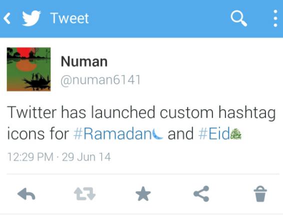 বিশ্বকাপ ফুটবলে ব্যবহারকারীদের নির্দিষ্ট দেশের পতাকা প্রতীক হিসেবে ব্যবহারের সুযোগ দেয় টুইটার৷ ব্যবহারকারীরা তাঁদের ব্যবহৃত বার্তার মধ্যে পছন্দমতো দেশের পতাকা ব্যবহার করেন৷ একইভাবে রমজান মাস ও ঈদের জন্যও এভাবে প্রতীক ব্যবহার করা যাবে৷