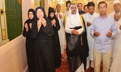 রবিবার রাতে তারা সেখানে পরিবার-পরিজন নিয়ে তারাবীর নামাজ আদয় করেন এবং এরপরে মহানবী (সাঃ) এর রওজা মোবারক জিয়ারত শেষে নফল নামাজ আদায় করেন।