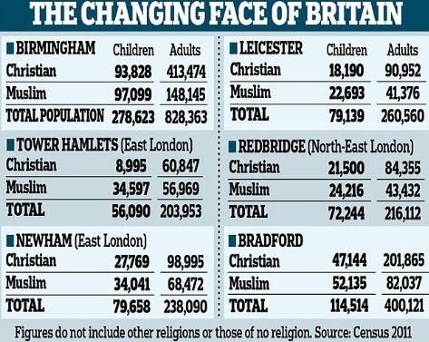 ব্রিটেনের দ্বিতীয় নগরী বার্মিংহামে ২,৭৮,৬২৩ শিশুর মধ্যে মুসলিম হিসেবে নিবন্ধিত হয়েছে ৯৭,০৯৯ জন, খ্রিস্টান হিসেবে ৯৩,৮২৮ জন। বাকিরা হিন্দু, ইহুদি।