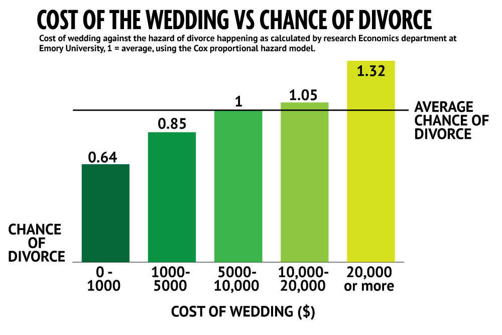 গবেষণায় বলা হয়েছে, বিয়েতে যতসম্ভব কম খরচ করুন। যেসব বিয়েতে ২০ হাজার ডলারের বেশি খরচ হয় তাদের বিবাহ বিচ্ছেদের অশঙ্কা যারা পাঁচ হাজার থেকে ১০ হাজার ডলার খরচ করেন তাদের চেয়ে ৩.৫ গুন বেশি। আর যারা পাঁচ থেকে ১০ হাজার ডলারের মধ্যে অথবা এক হাজারের ডলারের (বাংলাদেশী মুদ্রায় ৭৭ হাজার পাঁচশ’ টাকা) মধ্যে বিয়ের আনুষ্ঠানিকতা সারেন তাদের বিবাহ বিচ্ছেদ হওয়ার আশঙ্কা এর চেয়ে অনেক গুন কম।