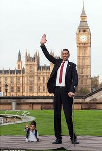 বিশ্বের দীর্ঘতম লোকটির পাশে যদি ক্ষুদ্রতম মানুষটি দাঁড়ান কেমন মনে হবে? সেটাই ঘটেছে বুধবার লন্ডনে। গিনেস ওয়ার্ল্ড রেকর্ড ডেতে পার্লামেন্ট হাউজে তারা পাশাপাশিই দাঁড়িয়েছিলেন। ৮ ফুট ১ ইঞ্চি তুরস্কের সুলতান কোসেন এখন বিশ্বের সবচেয়ে লম্বা মানুষ। আর নেপালের চন্দ্র দাঙ্গির উচ্চতা মাত্র ২১.৫ ইঞ্চি। তারা এই প্রথম একসাথে হলেন। বৃহস্পতিবার ডেইলি মেইল এ খবর প্রকাশ করেছে।