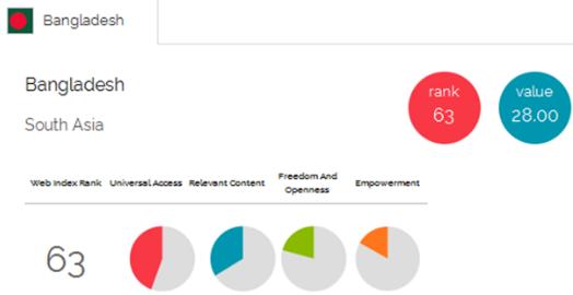 ইন্টারনেটকে ইতিবাচকভাবে ব্যবহার করে বৈশ্বিক উন্নয়ন ও মানবাধিকার সংশ্লিষ্ট বিভিন্ন বিষয় বিবেচনা করে এ ইনডেক্স প্রকাশ করা হয়। এবারের ইনডেক্সে বাংলাদেশের স্কোর ছিল ২৮। এ তালিকায় প্রতিবেশী দেশ ভারত ৪৪.৬০ স্কোর করে ৪৮তম, ২৩.৯৫ স্কোর করে নেপাল ৬৯তম স্থানে, ১৭.৭৬ স্কোর করে পাকিস্থান ৭৬তম অবস্থানে রয়েছে। ইনডেক্সের সর্বনিম্ন তিন অবস্থানে রয়েছে ইয়ামেন, মিয়ানমার ও ইথিওপিয়া।