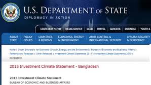 মার্কিন যুক্তরাষ্ট্রের স্টেট ডিপার্টমেন্টের ব্যুরো অব ইকোনমিক অ্যান্ড বিজনেস অ্যাফেয়ার্স প্রকাশিত ‘২০১৫ ইনভেস্টমেন্ট ক্লাইমেট স্টেটমেন্টে’ এমন পর্যবেক্ষণ দেয়া হয়েছে।