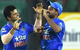 ভারতীয় ব্যাটসম্যানদের মধ্যে রোহিত শর্মা (২৯), বিরাহ কোহলি ২৫), রাইডু (৪৪), ধোনি (৭৫), স্টুয়াট বিনি (১৭), পেটেল (১০), শেখর ধাওয়ান (৭৫) ও সুরেশ রায়না (৩৮) রান করে আউট হন।
