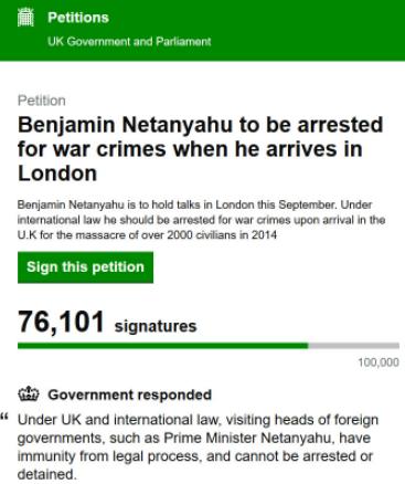 লন্ডন সফরের সময় ইসরাইলের প্রধানমন্ত্রী বেনিয়ামিন নেতানিয়াহুকে গ্রেফতারের আবেদনে ৭৬ হাজারের বেশি সই সংগ্রহ হয়েছে। ব্রিটিশ সংসদের ওয়েবসাইটে প্রকাশিত অনলাইন আবেদনে যুদ্ধ অপরাধের দায়ে নেতানিয়াহুকে গ্রেফতারের যে দাবি জানানো হয়েছে তাতে এসব সই দেয়া হয়েছে। ৬৫ বছর বয়সী লিকুদ পার্টির নেতা নেতানিয়াহু’র আগামী মাসে লন্ডন সফরের কথা রয়েছে।