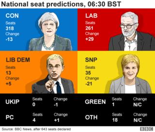 বিবিসির হিসাব অনুযায়ী, প্রধানমন্ত্রী টেরেসা মে’র দল ৩১৮টি আসন পাবে আর বিরোধী লেবার পার্টি পাবে ২৬২টি। একক সংখ্যাগরিষ্ঠতার জন্য প্রয়োজন ৩২৬টি আসন।