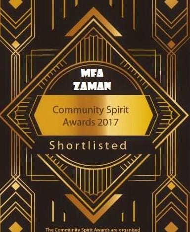 এমএফএ জামান ২০১৭ সালের দ্যা ক্যালাডরেল কমিউনিটি স্পিরিট অব দ্যা ইয়ার এ্ওয়ার্ডের জন্য মনোনীত হয়েছেন। ২৫ বছর পূর্তি উপলক্ষে দ্যা কমিউনিটি ফাউন্ডেশন ফর ক্যালাডরেল, হ্যালিফেক্স ব্রিটিশ কমিউনিটিতে বিশেষ অবদানের স্বীকৃতি স্বরূপ বিভিন্ন অর্গানাইজেশন, চ্যারিটি, ব্যবসা প্রতিষ্ঠান এবং ব্যক্তিদের এওয়ার্ড প্রদান করবে।