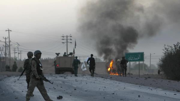 Afghan soldiers walk towards flames outside the U.S. Consulate after an attack by insurgents, in Herat province