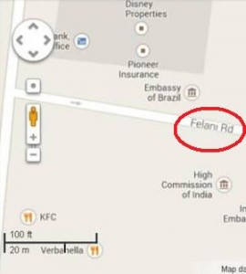 গুগল ম্যাপে বদলে গেল ঢাকার ইন্ডিয়ান হাই কমিশনের সামনের রাস্তার নাম। গুলশান সার্কেল-১ এর ১৪২ নম্বর এই সড়কটি এখন চিহ্নত হচ্ছে ‘ফেলানী রোড’ নামে। প্রাতিষ্ঠানিক কোনো স্বীকৃতি না থাকলেও শুক্রবার দুপুর থেকে গুগল ম্যাপে যুক্ত হয়েছে নতুন এই সড়কের নাম।