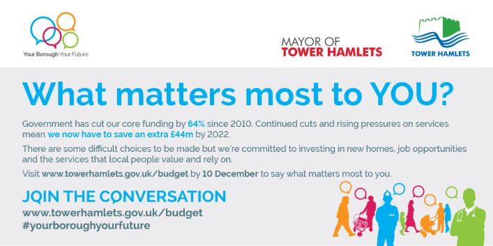 টাওয়ার হ্যামলেটস’ কাউন্সিল তার বাজেট প্রস্তাবণা তৈরী করেছে এবং এই প্রস্তাবিত বাজেট সম্পর্কে বাসিন্দা, ব্যবসায়ি সম্প্রদায় ও স্থানীয় বিভিন্ন গ্রুপের কাছ থেকে তাদের অভিমত জানতে শুরু করেছে বাজেট কনসালটেশন ‘ইওর বারা, ইওর ফিউচার’।