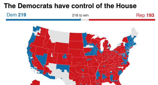 নিম্নকক্ষ হাউজ অব রিপ্রেজেন্টেটিভসের সবগুলো আসনে নির্বাচন হয়েছে। ৪৩৫ আসনের মধ্যে ২১৮টি আসন পেতে হবে সংখ্যাগরিষ্ঠতা পেতে। বাংলাদেশ সময় বুধবার বিকেল পর্যন্ত ৪১২টি আসনের ফলফল ঘোষণা করা হয়েছে। ডেমোক্র্যাটরা ইতোমধ্যেই ২১৯ আসন নিশ্চিত করেছে। এখানে পরাজয় হয়েছে প্রেসিডেন্ট ডোনাল্ড ট্রাম্পের দলের। -বিবিসি