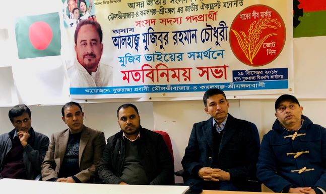 গত ১৯শে ডিসেম্বর বুধবার পূর্ব লন্ডনের বিএন পি অফিসে যুক্তরাজ্য বসবাসরত কমলগঞ্জ শ্রীমঙ্গল নির্বাচনী এলাকার এক মতবিনিময় সভা অনুষ্ঠিত হয় ঐক্য ফ্রন্ট প্রার্থী আলহাজ মুজিবুর রহমান চৌধুরীর সমর্থনে। সাবেক ছাত্রদল নেতা যুক্তরাজ্য জাসাসের সিনিওর সহ সভাপতি তরিকুর রশীদ চৌধূরী শওকতের সভাপতিত্বে শ্রীমঙ্গল উপজেলা ছাত্রদলের সাবেক নেতা আমিরুল ইসলামের পরিচালনায় অন্যান্যদের মধ্যে বক্তব্য রাখেন- শ্রীমঙ্গল উপজেলা ছাত্রদলের সাবেক সভাপতি ও