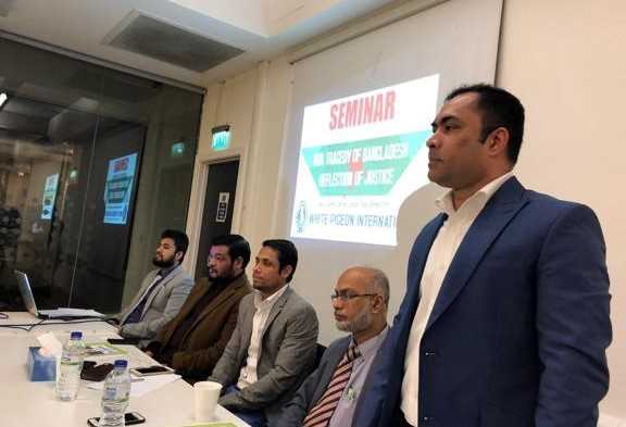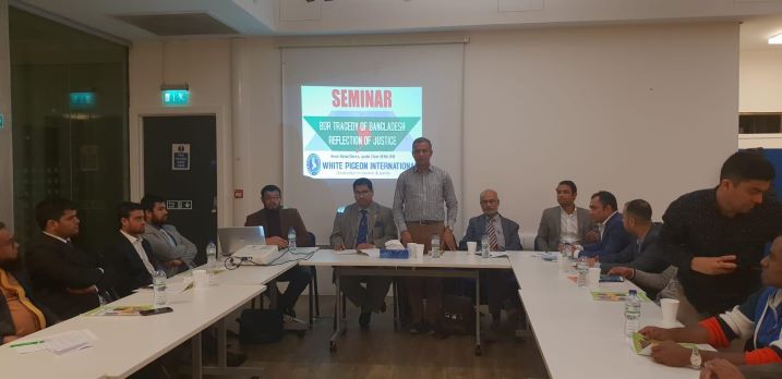 হাসনাত চৌধুরী: গত ২৬ ফেব্রুয়ারি ২০১৯ লন্ডনস্থ মানবাধিকার সংগঠন “হোয়াইট পিজন ইন্টারন্যাশনাল” এর উদ্যোগে পূর্ব লন্ডনের ওসমানি সেন্টার -এ “বিডিআর ট্র্যাজেডি অব বাংলাদেশ; রিফ্লেকশান অব জাষ্টিস “শীর্ষক এক সেমিনার অনুষ্ঠিত হয়। সংগঠনের চেয়ারম্যান মোহাম্মদ আলা উদ্দিন ও সেক্টেটারী জেনারেল মো: আবু নাসের এর যৌথ পরিচালনায় এবং বিশিষ্ট মানবাধিকার আইনজীবি, নিউহ্যাম কাউন্সিল এর ডেপুটি স্পীকার ব্যারিষ্টার নাজির আহমদ এর সভাপতিত্বে সেমিনারে প্রধান অতিথি হিসেবে বক্তব্য রাখেন বাংলাদেশের রাষ্ট্রপতির সাবেক উপদেষ্টা মোখলেছুর রহমান চৌধুরী, বিশেষ অতিথি হিসেবে বক্তব্য রাখেন বিশিষ্ট সাংবাদিক বাংলাদেশের সাবেক রাষ্ট্রপতির প্রেস সেক্রেটারী শামছুল আলম লিটন এবং কমিনিউটি বাক্তিত্ত্ব নুর বকশ।