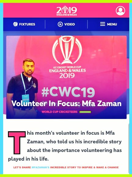 মানুষের স্বপ্ন থাকে আর যখন স্বপ্নটি হয় যদি একটু ব্যতিক্রম বিশ্ব ক্রীড়াঙ্গনে প্রতিনিধিত্ব করা। আর সেই স্বপ্নটি এবার পূরণ হয়েছে এমএফএ জামানের। লন্ডন অলিম্পিক ২০১২আর রাগবি বিশ্বকাপ ইংল্যান্ড ২০১৫ এর পর তিনি ক্রিকেট বিশ্বের সবচেয়ে বড় আর মর্যাদাপূর্ণ আসর আইসিসি ক্রিকেট বিশ্বকাপ ২০১৯ এর ওর্য়াল্ডকাপ ক্রিকেটিয়ারসে অংশগ্রহণ করছেন। এছাড়া জামান আইসিসি ক্রিকেট বিশ্বকাপের সিলেক্টর প্যানেলে নির্বাচক হিসেবে দায়িত্ব পালন করেছেন। ২০ বছর পর ইংল্যান্ড এবং ওয়েলসে ৬ সপ্তাহব্যাপী ১১টি মাঠে ১০টি দলের ৪৮ টি ম্যাচ নিয়ে অনুষ্টিত বিশ্বকাপ টুর্নামেন্টকে সবচেয়ে সাফল্যমন্ডিত করে তুলতে ৪০০০ ভলান্টিয়ার অংশগ্রহণ করবেন।