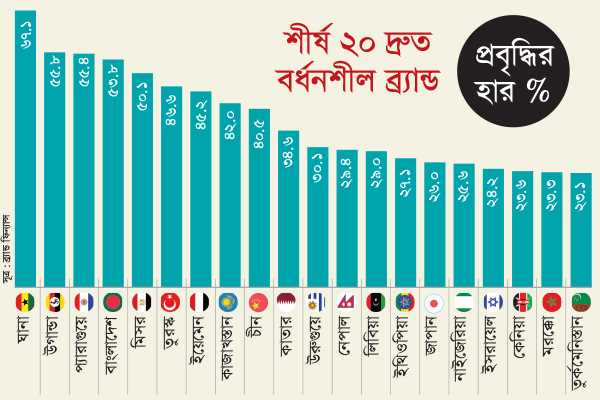 নেশন ব্র্যান্ডস ২০১৮ প্রতিবেদনে বাংলাদেশের ব্র্যান্ড ভ্যালু ছিল ২৫৭ বিলিয়ন ডলার। সর্বশেষ প্রতিবেদনে তা বেড়েছে ৫৩ দশমিক ৮ শতাংশ। এর চেয়ে বেশি হারে ব্র্যান্ড ভ্যালু বেড়েছে মাত্র তিনটি দেশের। এর মধ্যে প্রথমেই আছে ঘানা। দেশটির ব্র্যান্ড ভ্যালু বেড়েছে ৬৭ দশমিক ১ শতাংশ। দ্বিতীয় ও তৃতীয় স্থানে থাকা উগান্ডা ও প্যারাগুয়ের ব্র্যান্ড ভ্যালু বেড়েছে যথাক্রমে ৫৫ দশমিক ৮ ও ৫৫ দশমিক ৪ শতাংশ।