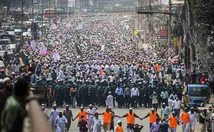 আজ মঙ্গলবারও ফ্রান্সের প্রেসিডেন্টের ম্যাখোঁর বিচার এবং দেশটির পণ্য বর্জনের দাবিতে রাজধানী ঢাকাসহ সারাদেশে ঈমানদার মুসল্লিরা বিক্ষোভ করেন। নবী প্রেমিক মুসল্লিরা ফ্রান্সে নবীর ব্যঙ্গচিত্র কার্টুন প্রকাশের প্রতিবাদে ইসলামী আন্দোলন বাংলাদেশের আমীর মুফতি সৈয়দ মুহাম্মদ রেজাউল করীমের নেতৃত্বে হাজার হাজার মুসল্লি ঢাকাস্থ ফ্রান্স দূতাবাস ঘেরাও কর্মসূচি পালন করেন। বায়তুল মোকাররম জাতীয় মসজিদের উত্তর গেইট থেকে বিক্ষোভ সমাবেশ শেষে দূতাবাস ঘেরাও করার লক্ষ্যে বিশাল মিছিল শান্তিনগর বাজারের সামনে পৌঁছলে পুলিশি বাধার সম্মুখীন হয়। এসময় পুলিশ ও বিক্ষোভকারী মুসল্লিদের মাঝে ধাক্কাধাক্কির ঘটনা ঘটে।