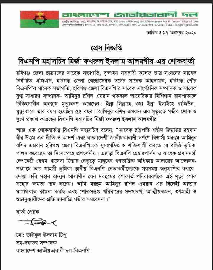 বিএনপি মহাসচিব মির্জা ফখরুল ইসলাম আলমগীর এর শোকবার্তা: আমিনুর রশিদ এমরান এর মৃত্যুতে গভীর শোক ও দু:খ প্রকাশ করেছেন বিএনপি সহাসচিব মির্জা ফখরুল ইসলাম আলমগীর।