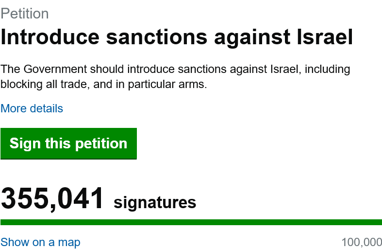 ইসরাইলের সঙ্গে সব ধরনের ব্যবসা ও সামরিক কর্মকান্ড বন্ধ করার পাশাপাশি দেশটির ওপর নিষেধাজ্ঞা দেওয়ার দাবিতে যুক্তরাজ্য সরকারের কাছে লেখা এক চিঠিতে এখন পর্যন্ত তিন লাখ ৫৫ হাজার ৪১ জন মানুষ গণস্বাক্ষর করেছেন। যুক্তরাজ্য সরকারকে লেখা ওই চিঠিতে বলা হয়, ফিলিস্তিনে নারী ও শিশুদের ওপর বোমা হামলাসহ সাধারণ মানুষের ওপর গণহত্যা চালাচ্ছে ইসরাইল। এছাড়াও দেশটি আন্তর্জাতিক নিয়মনীতির তোয়াক্কা না করে অবৈধ ইহুদি বসতি গড়তে ফিলিস্তিনিদের ঘরবাড়ি দখল করতে তাদের গুলি করে হত্যা করছে। গণস্বাক্ষর-সংবলিত চিঠিটি পরে সরকারি ওয়েবসাইটে প্রকাশ করা হয় (https://petition.parliament.uk/petitions/585314)।