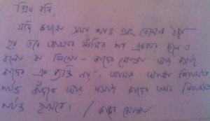 সালাম। নিতান্ত বাধ্য হয়েই তোমার সেবক মতির বিরুদ্ধে তোমার নিকট নালিশ জানালাম। ইদানিং কোনো জানি আমার বেশি বেশি ডাল আর উস্তা ভাজি খেতে ইচ্ছে করে। আমার নিজের অর্থ দিয়ে এসব কিনে খাওয়া যে সম্ভব নয় তা তুমি জানো। তুমি আমার জন্য এ যাবৎ অনেক কিছু করেছ- আর তাই তোমার উপর অজানা এক অধিকার জন্ম নিয়েছে। সেই অধিকার বলে আমার সেবককে বলেছিলাম চোখায় (রান্না ঘরে) যখন খাবার ভাগাভাগি হয় তখন মামুনদের ভাগ থেকে একটু ডাল আর উস্তাভাজি বেশি করে নিও আমার জন্য। কিন্তু তোমার সেবক আমাকে এই সুযোগ দেয়নি। জীবন-মৃত্যুর শেষপ্রান্তে দাড়িয়ে এই অভাগা তার ছোট ভাইয়ের নিকট একটু ডাল আর উস্তাভাজি চেয়ে যদি অন্যায় করে থাকি তবে মাফ করে দিয়ো। ইতি-